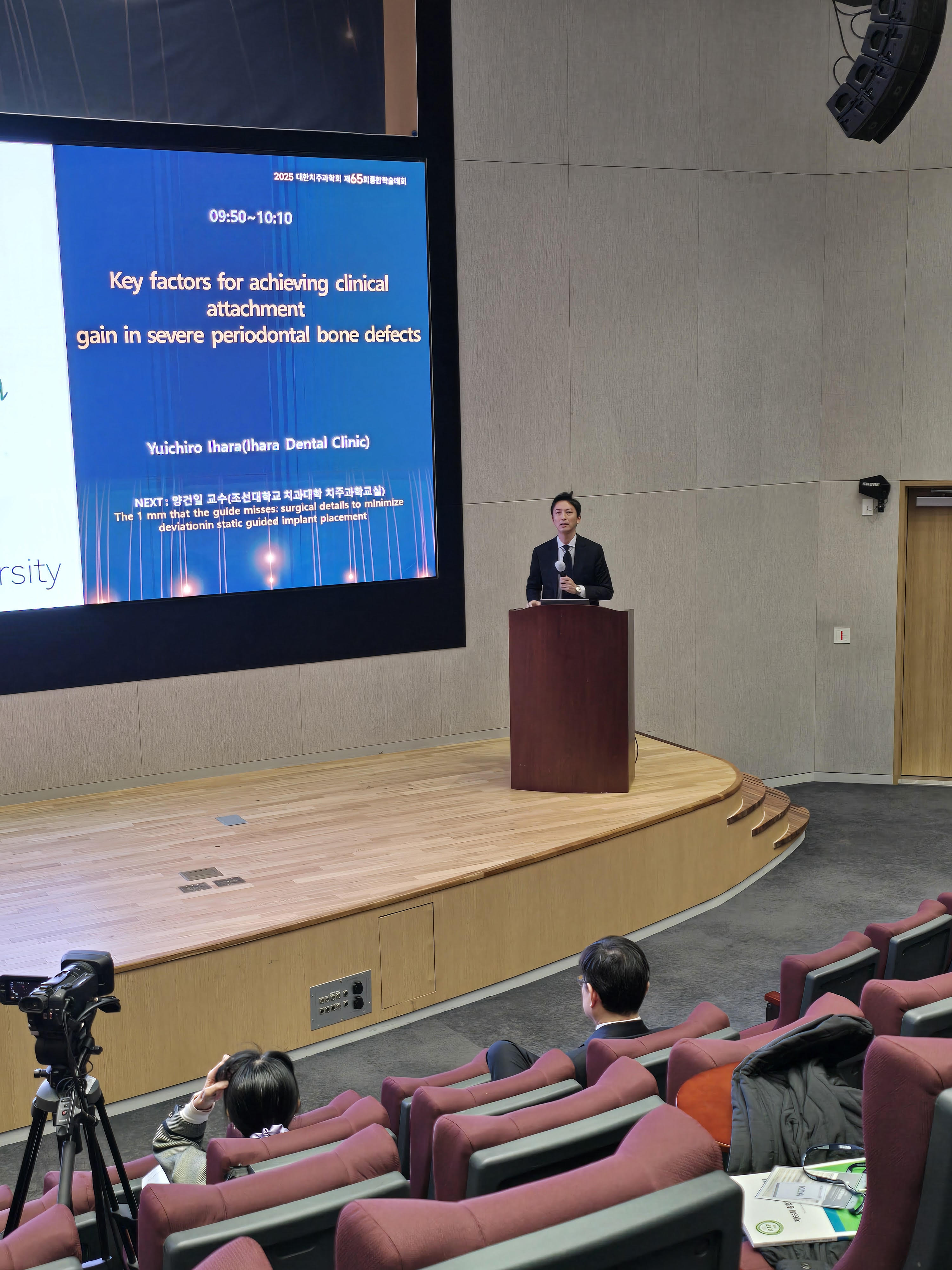 第65回韓国歯周病学会で講演させていただく機会をいただきした。テーマは根尖付近にまでおよぶ重度の骨吸収を伴う歯に対する歯周組織再生療法についてお話ししました。